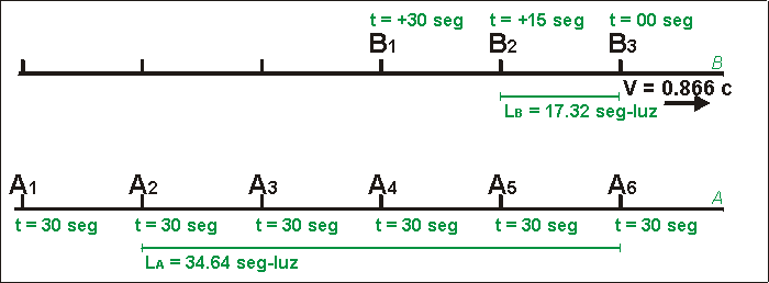 La Fig. 1 nos muestra una instantánea "mágica" del estado de cosas que describirían los observadores del sistema A cuando sus relojes marcan 00 seg y la velocidad relativa entre ambos ejes es de 0.866 c (con un coeficiente de Lorentz de 0.5).
